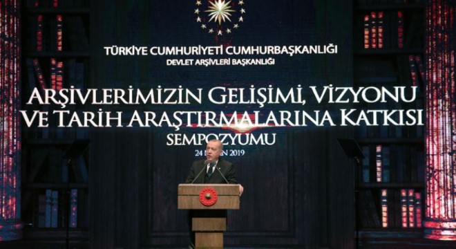 Mevcut arşivin korunması yanında devlet belgelerinin nasıl muhafaza ve tasnif edileceği konusunda geçmişte ciddi sıkıntılar yaşandığını kaydeden Erdoğan, “Devlet Arşivleri Başkanlığını Cumhurbaşkanlığına bağlayarak belirsizlikleri ortadan kaldırdık. Arşivciliğimizin önünde yeni bir dönem açmış bulunuyoruz. Meclis ve istihbarat dışındaki tüm kurumlarımızın arşivleri artık merkezi olarak yönetiliyor. Bundan sonra devlet belgelerimizi ecdadımızın hassasiyetinde koruyacak ve değerlendireceğiz. Tek parti döneminde milletimizin geçmişi ile bağlarının kopartılmasına yönelik yanlış bir politika izlenmiştir. Osmanlı’yı reddeden, Selçuklu’yu görmezden gelen, İslam medeniyetine düşman kesilen, Türk tarihini daracık bir kovuğa hapsetmek isteyen kısır bir anlayış türetilmiştir. Yeni nesillerin kafasında sanki milletimizin tarihi 1919’da başlıyor, daha öncesi bize ait değil gibi bir yaklaşım nakşedilmeye çalışılmıştır. Evlatlarımız kendilerine okul kitaplarında anlatılan tarih ile babalarından, çevrelerindeki alim büyüklerinden tevarüs ettikleri bilgiler arasında şaşırıp kalmışlardır. Milletimiz o engin irfanı ile bu dayatmayı reddetmiş ve tarihine sahip çıkmıştır. Buna rağmen yaşanan süreçte ortaya çıkan tahribatı küçümsemek mümkün değildir. Arşivcilik açısından baktığımızda dahi karşımızda eşsiz bir hazine durduğunu görüyoruz. Osmanlı arşivi öyle bir hazine ki, sadece ülkemizin değil aynı zamanda 40’dan fazla devletin geçmişini içinde barındırıyor. Türkiye arşivlerinde kendisi ile birlikte dev bir coğrafyanın hafızasını saklıyor. Bugün bölgemizdeki pek çok uluslararası sorunun çözümünün Osmanlı arşivlerinde aranması boşuna değildir. Bölgemizdeki kimi ülkeler ve örgütler hem haydutlukla, zorla, baskıyla, hileyle demografiyi değiştiriyor hem de buna hukuki kılıflar uydurmaya çalışıyor. Bunlara diyoruz ki, bizim arşivlerimizdeki kayıtlar bu bölgelerin gerçek sahiplerini tüm açıklığı ile ortaya koymaktadır. Coğrafyada adalet yeniden tesis edildiğinde elimizdeki belgelerin yardımı ile inşallah hak yerini bulacaktır” şeklinde konuştu.