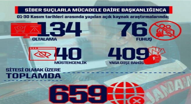 Jandarma Genel Komutanlığı Siber Suçlarla Mücadele Daire Başkanlığı, 1-30 Kasım tarihleri arasında yasa dışı 659 site hakkında işlem yapıldığını açıkladı.
