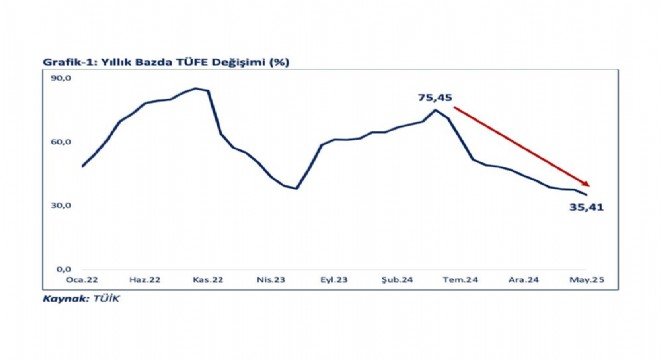 "Bunun sonucunda 2024 Mayıs ayına kıyasla enflasyon son 12 ayda 40,0 puan üzerinde gerilemiştir. Yİ-ÜFE'deki (2003=100) değişim 2025 yılı Mayıs ayında bir önceki aya göre yüzde 2,48 olarak gerçekleşmiş, böylece yıllık enflasyon yüzde 23,13 olarak gerçekleşmiştir. Çekirdek TÜFE C endeksinde (enerji, gıda ve içecekler ile tütün ürünleri ve altın hariç, TÜFE) yıllık enflasyon bir önceki aya göre yüzde 2,43 olarak gerçeklemiş yıllık enflasyon ise yüzde 35,37 olmuştur. Fiyat katılığının yüksek olduğu hizmetler grubunda yıllık enflasyon bir önceki aya göre 3,4 puan gerileyerek yaklaşık son 35 ayın en düşük seviyesi olan yüzde 51,2 olmuştur."