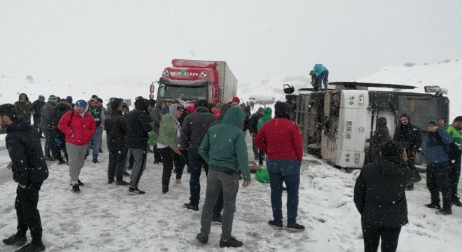 Alınan bilgilere göre, TFF 1. Lig Erzurumspor-Bursaspor maçını izlemek için Erzurum’a gelen Bursaspor taraftarını taşıyan otobüs, saat 09.15 sıralarında Tepebaşı Geçidi yakınlarında kaza yaptı. 50 kişilik Bursaspor’u taraftarı taşıyan otobüs seyir halindeyken önündeki tıra çarpmamak için manevra yaptı. Yolların aşırı buzlanması nedeniyle 16 AHL 409 plakalı otobüs, kontrolden çıkarak devrildi.