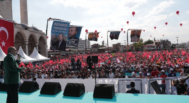 Cumhurbaşkanı Erdoğan, şöyle devam etti: "Hiçbir konuda verdiği sözün arkasında duramayan bir parti ve ekibi bulunuyor. Kardeşlerim, böylece ne sözün, ne belgenin ve hatta ne de namus üzerine edilen yeminlerin bunların meşrebinde bir hükmü olmadığını gördük. Seçim döneminde bir tiyatro oynamışlar. 15 Temmuz’da tiyatro diyenler asıl tiyatroyu kendileri seçimlerde oynadılar. CHP 31 Mart seçiminden beri hayata geçirdiği bir tiyatro sergiliyor. Bunun adı sahtekarlık, riyakarlıktır, düzenbazlıktır. Sözlerini tuttukları şeyler de var. Köşe bucak kaçırdıkları sözleri harfiyen yerine getiriyorlar. İstanbul Belediye Başkanı Diyarbakır’da. Kimlerle neyi konuşuyor. Teröre bulaşmış olanlarla el ele dirsek temasında ve ne diyor, biz sizlerle beraberiz. Her fırsatta bir araya geliyorlar. Özellikle İstanbul’u nasıl birlikte böleceklerinin hesabını yapıyorlar. Görevden alınan belediye başkanlarının yanına koyarak onlara destek veriyorlar. Ülke ve milletin yanında olacaklarına terör örgütü güdümündeki partinin borazanlığına soyunuyorlar. 15 Temmuz faillerini lanetleyemeyenler, her zaman ülkesinin yanında yer alamayanlar siyasetçi, belediye başkanı olmaz. Bugün oynadıkları rollerle milleti kandırdıklarını sananlar en kısa sürede gerçek yüzleri ortaya çıkınca Allah’ın izniyle milletten cevabını alacaklar."