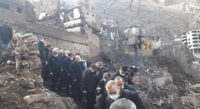 Yangının yaşandığı mahalleyi gören bir tepeden bölgeyi inceleyen Bakanlar Vali Yılmaz Doruk'tan da bilgi aldı.