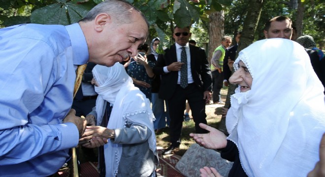 Cumhurbaşkanı Recep Tayyip Edoğan, Çamlıca’daki Radyo-TV kulesindeki incelemelerinin ardından, koru içerisinde vatandaşlarla buluştu. Makam aracından inen Erdoğan, ağaç altında oturan yaşlı iki kadına sarılarak elini öptü ardından çocuklarla bol bol fotoğraf çektirdi.