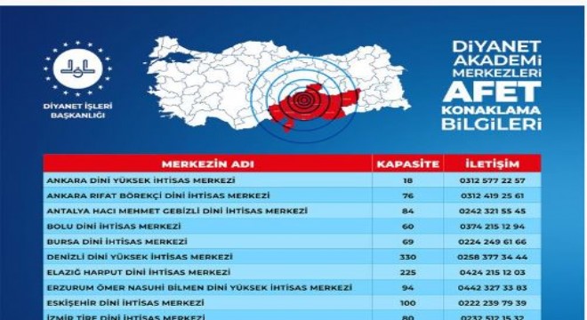 Diyanet İşleri Başkanlığı. Ankara, Antalya, Bolu, Bursa, Denizli, Elazığ, Erzurum, Eskişehir, İzmir, Kastamonu, Kayseri, Kocaeli, Konya, Kütahya, Manisa, Ordu, Rize, Samsun, Tekirdağ, Trabzon, Van ve Yozgat illeri olmak üzere 22 ildeki 23 Dini Yüksek İhtisas Merkezi’nde toplam 2 bin 521 deprem mağdurunun; Antalya’nın Aksu, Döşemealtı, Kepez, Muratpaşa, Alanya, Elmalı; Bingöl Merkez, Solhan, Karlıova; Bitlis Merkez, Tatvan; Erzincan Merkez; Kayseri Hacılar, Kocasinan, Melikgazi; Konya Akşehir, Beyşehir, Çumra, Emirgazi, Hadim, Kadınhanı, Karapınar, Karatay, Meram, Selçuklu, Seydişehir, Sarayönü; Mardin Artuklu, Dargeçit, Kızıltepe, Midyat; Mersin Mut, Akdeniz, Bozyazı, Toroslar, Tarsus, Mezitli, Anamur; Muş Bulanık; Nevşehir Merkez, Acıgöl; Sivas Merkez, Suşehri, Kangal; Niğde Merkez, Bor ilçeleri olmak üzere 12 ildeki 83 Kur’an kursunda toplam 3 bin 124 merkezi depremzedelerin hizmetine açtı.