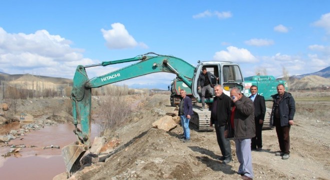 Ekipler, Oltu’nun Gökçedere Mahallesinin arazisini sulamak için Oltu çayına tahkimat ve bent çalışmalarını korona virüsüne rağmen çalışmalarını sürdürüyor .