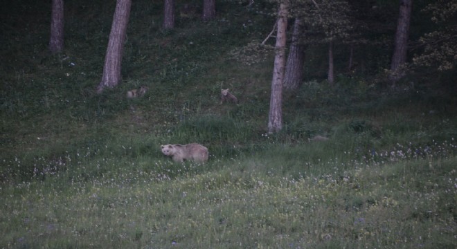 İki yavrusuyla birlikte yiyecek arayan boz ayı etrafındakilere aldırış etmezken, yavru ayılar ise oynayarak annelerine eşlik etti.