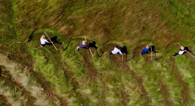 Öte yandan, imece usulü tırpan ile ot biçme havadan görüntülendi.