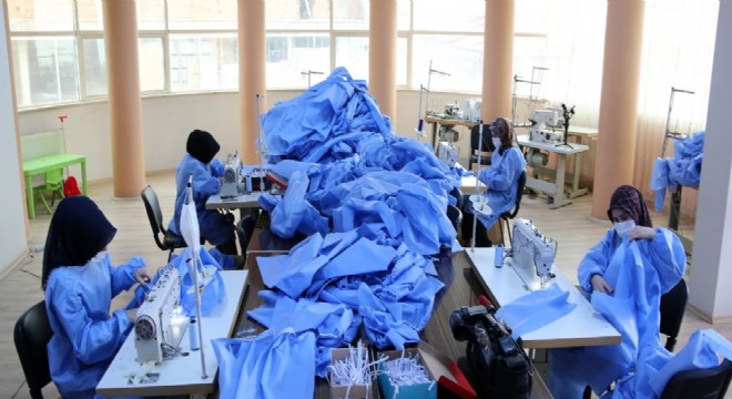 Erzurum Büyükşehir Belediyesine bağlı ESMEK’lerde Kovid-19 seferberliği başlatıldı. ESMEK personelleri ve eğitimcilerinden oluşan ekip, günde 300 tulum önlük dikip sağlık kuruluşlarına teslim ediyor.