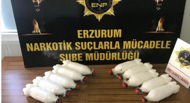 Erzurum’da polis ekipleri tarafından kontrol noktasında durdurulan bir araçta yapılan aramada yakıt deposuna gizlenmiş 10 pet şişe içerisinde 6 kilo 350 gram metamfetamin ele geçirildi.