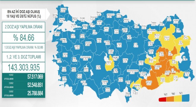 En az 2 doz aşı olmuş 18 yaş üzeri nüfusu kapsayan verilere göre Türkiye'de 2. doz aşılama ortalama yüzde 84,66 oldu. 1. doz ortalaması yüzde 92,66 olurken, 1., 2. ve 3. doz aşısını olan vatandaş sayısı toplamda 143 milyon 303 bin 935’e yükseldi.