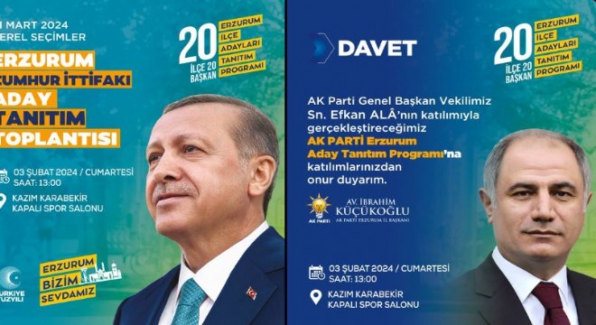 ‘Erzurumlu Hemşehrimiz, Şehrimizin Medarıiftiharı, AK Parti Genel Başkanvekilimiz Sayın Efkan Ala Bey'in katılımıyla 3 Şubat Cumartesi günü saat:13.00’te Kazım Karabekir Kapalı Spor Salonu’nda gerçekleştireceğimiz Erzurum Cumhur İttifakı Aday Tanıtım Toplantımıza tüm hemşehrilerimiz davetlidir. ‘ çağrısında bulundu