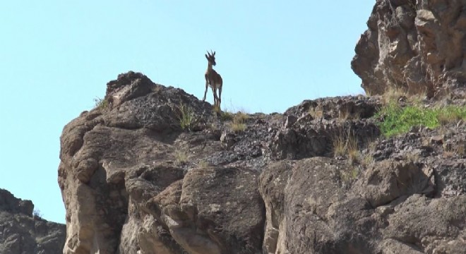 Erzurum - Olur karayolunda seyreden sürücüler yol kenarında gördükleri yaban keçilerini izlemek için araçlarını yol kenarına park edip keçileri fotoğraflamaya çalışıyor. Kayalıklar üzerinden adeta poz veren keçiler ise sürü halinde otlamayı sürdürdü. Yaklaşık 10 yaban keçisi renkli görüntüler oluştururken, vatandaşların meraklı bakışları arasında gözden kayboldu.