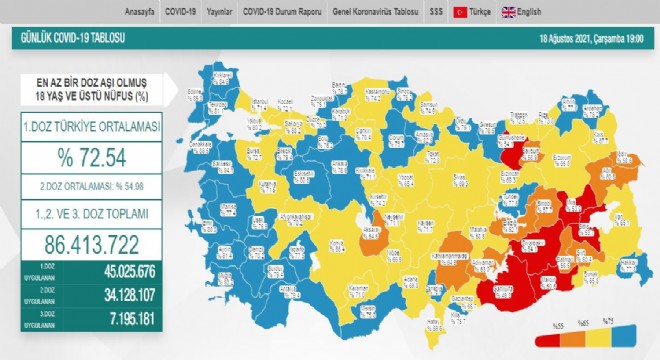 Bakanlığın tablosuna göre yüzde 48,6 ile Türkiye'de en az aşılamanın gerçekleştirildiği Şanlıurfa’yı sırasıyla Mardin, Bitlis, Muş, Diyarbakır, Gümüşhane, Batman, Bingöl, Iğdır ve Bayburt takip etti.