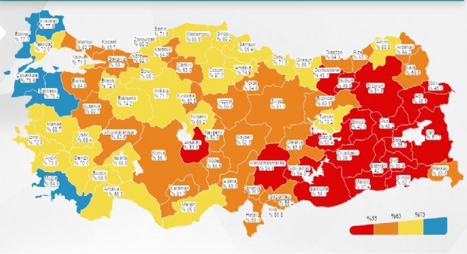 24 Temmuz Cumartesi günü yayımlanan Kırmızı, turuncu, sarı ve mavi kategorilerle ifade edilen toplam nüfus içinde aşı oranı haritasında Doğu Anadolu Bölgesinden Erzurum’la birlikte 8 il kırmızı kategoride, Tunceli sarı, Malatya, Ardahan, Kars, Hakkari ve Erzincan illeri ise turuncu kategoride yer aldı.