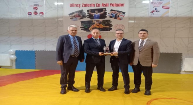 Şair Nefi Ortaokulu Müdürü Hasan Basri Özcan’a destekleri için teşekkür eden Gençlik ve Spor İl Müdürü Levent Çakmur, sporsever okul müdürüne plaket takdim etti.