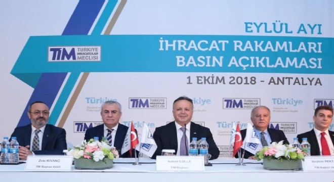 Türkiye İhracatçılar Meclisi (TİM) eylül ayı ihracat verilerini Antalya'da düzenlenen basın toplantısıyla açıkladı. Buna göre; eylülde ihracat geçen yılın aynı dönemine göre yüzde 22,5 artışla 14,5 milyar dolara yükseldi. Bu rakam bugüne kadar en yüksek ihracat gerçekleştirilen eylül ayı olarak kayıtlara geçti. Eylül ayında ayrıca ihracatta son 13 ayın en hızlı artışı yaşandı. Açıklanan verilere göre ilk 9 ayda ihracat yüzde 7 artışla 123 milyar 110 milyon dolar oldu.