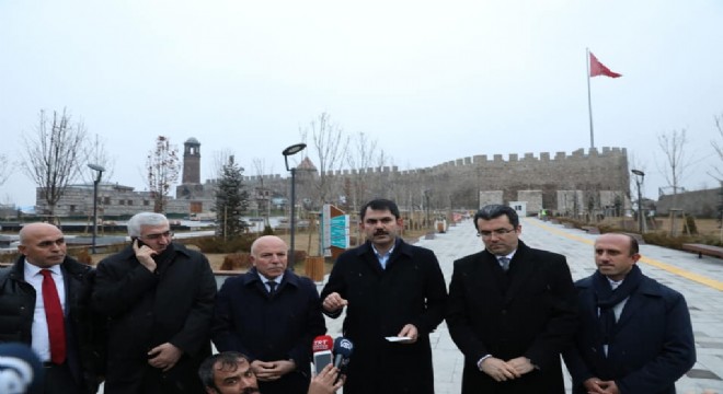 Erzurum’da kentsel dönüşümü devam eden Kale ve çevresinde yer alan alanda millet bahçesi yapılacağını belirten Bakan Kurum, “Bugün Erzurum’un problemlerini dinledik ve şehrimize ilişkin bakanlığımızca yapılması gerekli olan işlerin kararlarını aldık. Öncelikle Yıldızkent’te yapılan konutlarımızı yapıp ocak ayı içerisinde teslimlerimizi yapacağız. Dağ mahallesinde kentsel dönüşüm süreci var bu konuyla Büyükşehir Belediyemiz ilgileniyor. Bu konuda Büyükşehir Belediyesine maddi ve manevi yardımlarda bulunacağız. Kale çevresine düzenlemeler yapıp buraya millet bahçesi yapacağız. Bakanlık olarak buraya deste olup burayı millet bahçesi yapacağız. Hem burada ki tarihi eserler ortaya çıkacak ve gençlerimiz burada rahatça vakit geçirecek” diye konuştu.