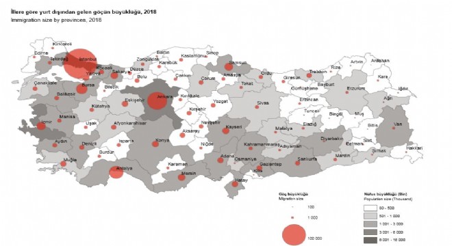 2018 yılında göç edenlerin illere göre dağılımında ise 201 bin 957 kişi ile en fazla göç alan ilin İstanbul olduğunu kaydeden Öncel, “İstanbul'u sırasıyla 71 bin 337 kişi ile Ankara, 36 bin 674 kişi ile Antalya, 22 bin 660 kişi ile Bursa ve 14 bin 671 kişi ile İzmir takip etti. Türkiye'den göç eden nüfusun illere göre dağılımına bakıldığında ise 113 bin 430 kişi ile İstanbul'un en fazla göç veren il olduğu görüldü. İstanbul'u sırasıyla 28 bin 410 kişi ile Ankara, 18 bin 408 kişi ile Antalya, 16 bin 789 kişi ile Gümüşhane ve 13 bin 468 kişi ile İzmir izledi” diye konuştu.