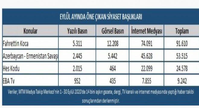 MTM tarafından hazırlanan raporda, Eylül ayının toplumsal ve siyasi olayları belirlendi. Yapılan araştırmaya göre, geçtiğimiz ay medyada en çok Sağlık Bakanı Fahrettin Koca konuşuldu. Azerbaycan ve Ermenistan arasında başlayan savaş, gündemde yoğun yer alan bir diğer konu oldu.