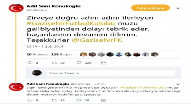 Ligin 20. haftasında Boluspor'u konuk ederek, sahadan 2-0 galip ayrılan Gazişehir Gaziantep, zirveye adım adım yaklaşıyor. Ligin ikinci yarısında namağlup yoluna devam eden Gazişehir, 29 puanla 5. sırada yer alıyor. İkinci yarının ilk 3 maçını kazanarak, sahadan ayrılan Gazişehir, seyirci ve yönetimi de sevince boğdu. Kulüp Başkanı Adil Sani Konukoglu, TFF 1. Lig’in ikinci yarısının ilk üç haftasında, sahadan galibiyetle ayrılan Gazişehir Gaziantep, Futbol takımını tebrik etti. Konukoğlu sosyal medya hesabından yaptığı açıklamada, “Ligin ikinci yarısının ilk 3 maçında üçte üç yapan Gazişehir Gaziantep Futbol Kulübümüzü mücadelelerinden dolayı kutluyorum. Bundan sonraki maçlarda aynı mücadeleyi devam ettirerek hedefimize ulaşacağız” ifadelerine yer verdi.