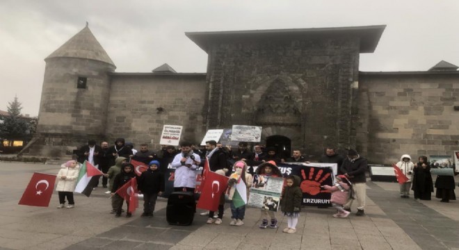 Erzurum Lala Mustafa Paşa Camisi avlusunda toplanan sağlık çalışanları, taşıdıkları pankartlarla Yakutiye Medresesi'ne yürüyerek İsrail saldırılarını protesto etti, Filistin halkına destek verdi.