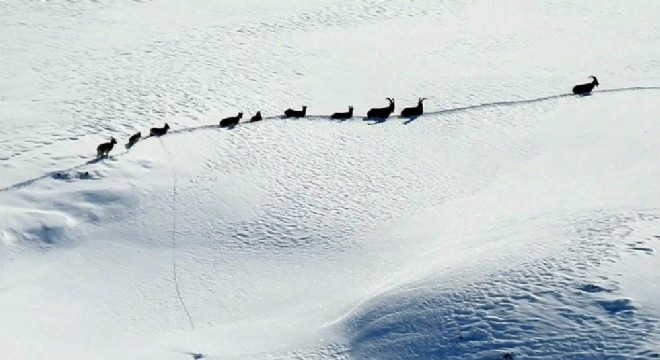 Erzincan ile Tunceli arasında yer alan 3 bin 300 rakımlı Munzur Dağlarında yabani hayvan popülasyonunda artış yaşanırken karlı dağları aşarak göç yoluna koyulan çengel boynuzlu dağ keçisi (şamua) sürüsü görüntülendi.