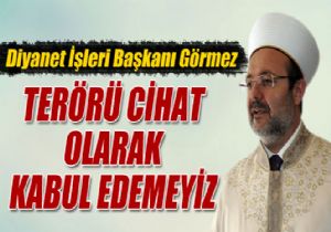 Yaşananların terör olduğunu kaydeden Görmez, “Müslüman bir başka Müslüman’ı müşrik göstererek onunla savaşır halinde olamaz. Mezheplerin bir din gibi algılanması ve bu algının topluma dayatılması İslam toplumunun birlikte yaşama iradesini bozmuştur. Mezhebine fikrine anlayışına uymayanı öldürmeyi kimse cihat olarak tarif edemez. Toplumda kaos çıkarma, insanları topluca öldürme, camileri bombalama, katliam yapmanın adı terördür. Terör cihat olarak kabul edilemez. İslam’ın cihadında terör bir yöntem olarak kabul edilemez ve uygulanamaz. Cihat terörün, vahşetin ve öldürmenin değil; diriltici bir gayretin hayat veren bir mücadelenin adıdır” diye konuştu.