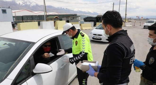 Erzincan'da yeni tip korona virüs (Kovid-19) salgını tedbirleri kapsamında polis ve jandarma ekipleri uygulama noktaları, cadde ve sokaklarda dolaşarak vatandaşa maske dağıttı. Erzurum ve Sivas istikametinden gelen araçları uygulama noktalarında durduran güvenlik güçleri hem denetim yaptı hem de kolonya ikramında bulunarak maske dağıttı.