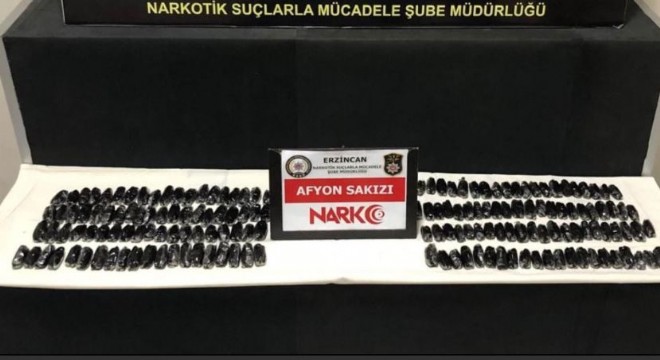 Erzincan İl Emniyet Müdürlüğü Narkotik Suçlarla Mücadele Şube Müdürlüğü ekiplerince uyuşturucu madde kullanımının ve ticaretinin engellenmesine yönelik yapılan çalışmalarda; Akyazı Polis Uygulama Noktasında durdurulan otobüste arama yapıldı. Otobüs yolcularından M.A., M.K. ve M.S.M. isimli İran uyruklu 3 şüphelinin yutma yöntemi kullanarak uluslararası uyuşturucu madde ticareti yaptıkları belirlenerek hastanede yapılan röntgen çekimlerinde vücutlarından 2 kilo 249 gram Afyon sakızı ele geçirildi.