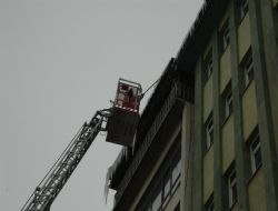 Erzurum’da çatılardan uzayan buz sarkıtları itfaiye ekipleri tarafından temizlendi.