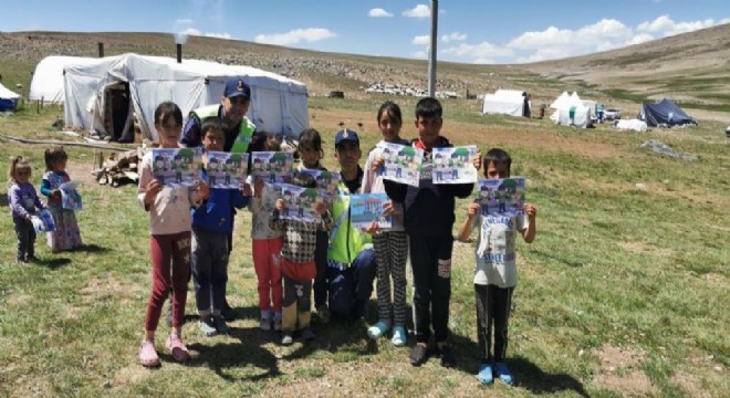Erzurum İl Jandarma Komutanlığı Trafik Jandarması Timlerince göçerlere eğitim verildi, çocuklara boyama kitabı dağıtıldı.