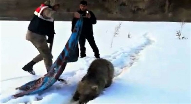Yavru ayının buz tutan gölette balık avlamaya çalıştığı ve bu sırada buzun kırılması üzerine suya düştüğü belirtildi.
