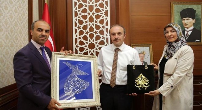 Pınar ile Çelebi de Vali Epcim’e destekleri dolayısıyla teşekkürlerini ileterek öğrenciler tarafından üretilen çanta ve tablo hediye etti.