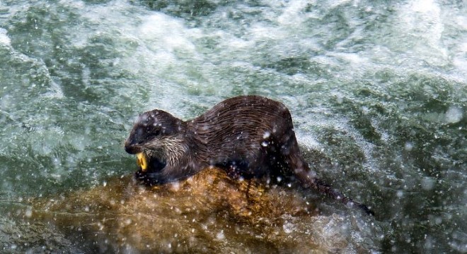 Dünya'da nesli tükenmekte olan türler arasında gösterilen ve koruma altında bulunan su samurları Erzincan'ın Kemah ilçesinden geçen Karasu Nehri'nde balık avlarken görüntülendi.