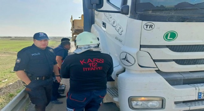Kars’ta seyir halindeyken alev alan iş makinesi yüklü tırı itfaiye ekipleri söndürdü.