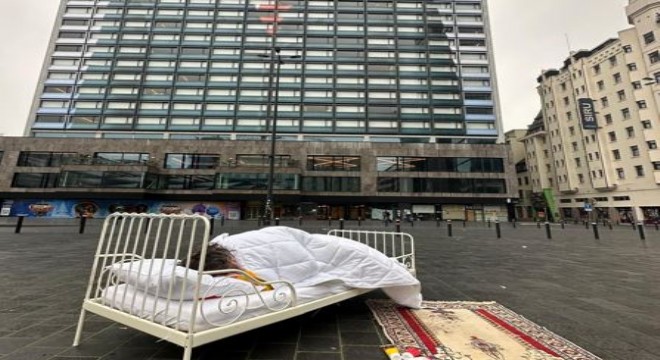 Göçmenlerin geçici barınma şartlarını simgeleyen metal karyolayı Brüksel Kuzey Tren İstasyonu'ndan Rogier Meydanı'na kadar sırtında taşıyan Kavukcu, performans sırasında karyolayı zaman zaman sürükleyerek ilerledi.