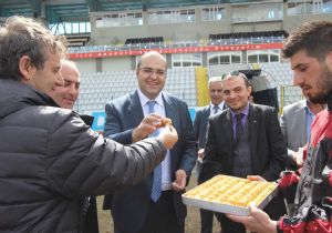 ERZURUM (İHA) - Aziziye Belediye Başkanı Muhammed Cevdet Orhan, haftasonu kader maçına çıkacak olan Erzurum Büyükşehir Belediyesporlu futbolculara tatlı jest yaptı. Antrenmana sürpriz bir ziyaret gerçekleştiren Başkan Orhan, futbolculara baklava ikram ederek, galibiyet sözü aldı. Belediyespor’un kader maçı öncesi yoğun idmanları sürerken, Başkan Orhan, Kulüp Başkanı Saim Özakalın ve yöneticilerle birlikte ziyaret ettiği idmanda futbolcular ile teknik heyete baklava ikram ederek, moral verdi.