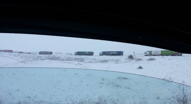 Çıldır Aktaş Sınır kapısı güzergâhında bulunan 2100 rakımlı Mozeret Tepesinde kilo metrelerce tır kuyruğu oluştu.