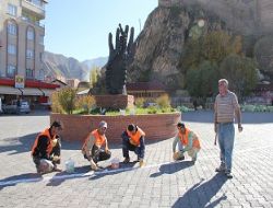 Belediye ve Türkiye İş Kurumu’ndan geçici olarak işe alınan işçiler şehir merkezindeki kaldırım bordürlerini ve Pazar yerini boyamaya devam ediyorlar.