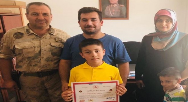 Oltu İlçe Jandarma Komutan Vekili Jandarma Astsubay Kıdemli Başçavuş Mehmet Dikbakan, Atatürk ilköğretim okulu 3. öğrencisi Baturalp Sayar’a Jandarma Genel Komutanlığı Asayiş Başkanı Tümgeneral Fuat günay imzalı katılım belgesini verdi.