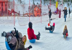 Palandöken Kayak Merkezinde leğenlerle kayan kadınlar, renkli görüntüler oluşturdu.