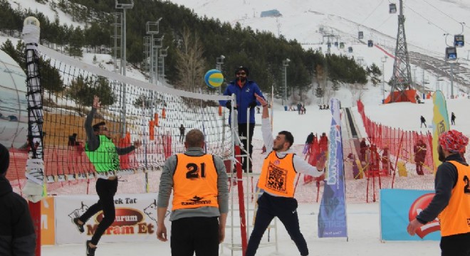 Erzurum Palandöken Kayak Tesislerinde Erzurum Voleybol İl Temsilciliğince ve Büyükşehir Belediye Erzurum’un destekleriyle Rize, Elazığ, Hatay, Kars ve Erzurum’dan sporcuların katılımıyla karda voleybol turnuvası bugün başladı.