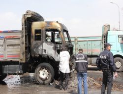 Polis yanan kamyonda incelemede bulundu. Yangının çöp konteynırından araca sıçraması üzerine çıkabileceği tahmin ediliyor.