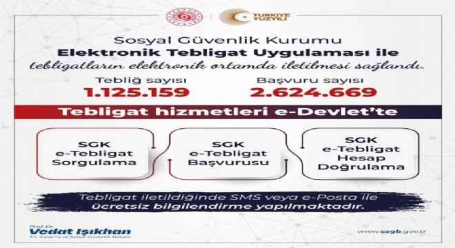 Çalışma ve Sosyal Güvenlik Bakanı Vedat Işıkhan sosyal medya hesabından yaptığı paylaşımda, SGK Elektronik Tebligat Uygulaması ile tebliğ edilmesi gereken evrakların elektronik ortamda imzalanarak tebligat adreslerine kolaylıkla iletilebilmesini ücretsiz sağladıklarını hatırlattı. Elektronik Tebligat Uygulaması'na yapılan başvuru sayısının haziran ayı itibarıyla 2 milyon 624 bin 669 olduğunu bildiren Işıkhan, birimler tarafından ilgili vatandaşlara elektronik ortamda ücretsiz iletilen tebligat sayısının ise 1 milyon 125 bin 159 olduğunu kaydetti.