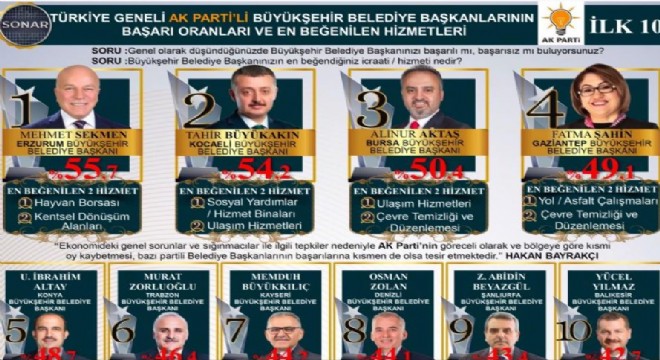 2022 yılında yapılan anketlerde de üç kez birinci seçilen Başkan Sekmen, SONAR Araştırma şirketi tarafından eylül ayında yapılan ankette yüzde 55,7 oy ile birinci seçilirken, aynı ankette ilçe belediyeleri arasında Yakutiye Belediye Başkanı Dr. Mahmut Uçar da yüzde 62.2 oy oranı ile ilçe belediyeleri arasında “Türkiye’nin en başarılı” İkinci Belediye Başkanı seçildi. Büyükşehir Belediyeleri arasında yapılan ankette vatandaşlara “En beğenilen iki hizmet” sorusuna Erzurumlular da “Hayvan Borsası ve Kentsel Dönüşüm Alanları” yanıtını verdi.