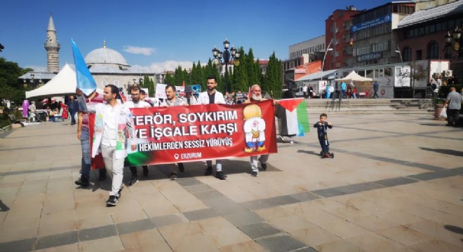Yakutiye Kent Meydanı Lala Paşa Cami önünde buluşan doktorlar, tıp fakültesi öğrencileri ile sağlık çalışanları, ellerinde Türk ve Filistin bayrakları ile Yakutiye Medresesi’ne kadar yürüdü.