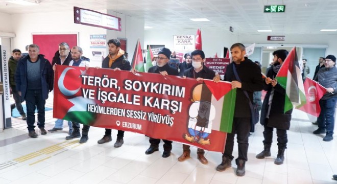 İsrail'in Gazze'ye yönelik saldırılarını protesto etmek amacıyla Erzurum'da görevli sağlık çalışanları sessiz yürüyüşlerinin 14. haftasında bir araya geldiler.