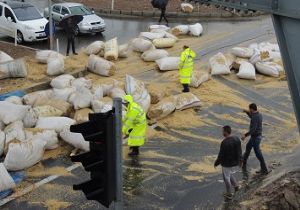Edinilen bilgiye göre, Şanlıurfa’dan Ağrı’ya saman götüren Mehmet Gez (25) yönetimindeki 63 EH 675 plakalı saman yüklü kamyon, Eleşkirt ilçe girişindeki üst geçide çarptı. Çarpmanın etkisiyle kamyonun kasasındaki saman çuvalları yola döküldü. Erzurum-Ağrı karayolu bir süreliğine trafiğe kapanırken, saman çuvallarının kaldırılmasıyla ulaşım kontrollü olarak sağlandı.
