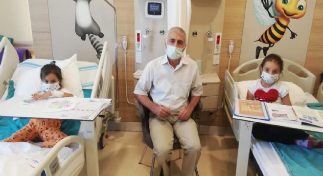 Erzurum Şehir Hastanesinde yanık tedavi merkezinde tedavi gören Havin Aslan (7) ve Amine Demir (9) hastanenin sınıf öğretmeni Halil Elitok nezaretinde eğitimlerinden geri kalmıyorlar.