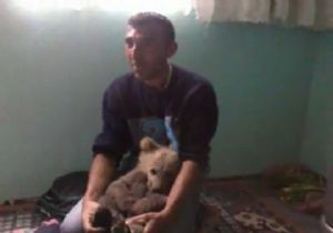 Erzurum’un Şenkaya ilçesine yaşayan Gürbüz Dilmaç, dağda bulduğu yavru ayıyı evine getirerek besledi.